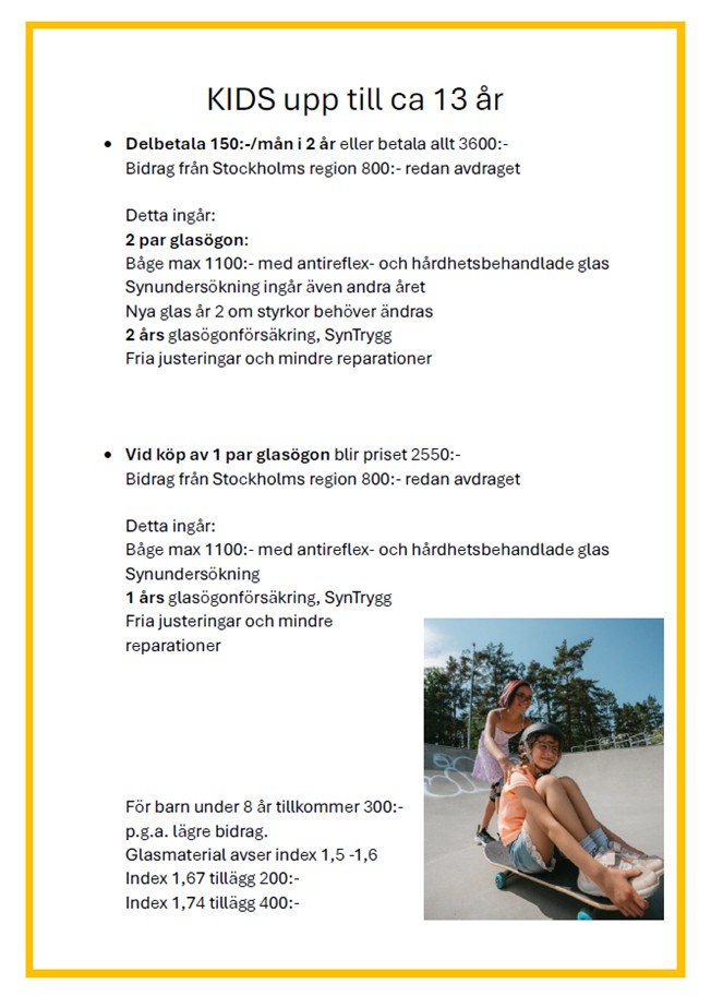 Alla barn och ungdomar, 0-19 år, får bidrag för glasögon och linser från regionen. För mer information hör av dig till oss eller läs här.